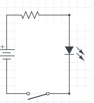 Create a series circuit, consisting of a 9V battery, resistor, switch, and LED. Here is a sample schematic: