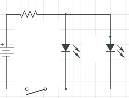Create a parallel circuit, consisting of a 9V battery, resistor, switch, and 2 LEDs. Here is a sample schematic: